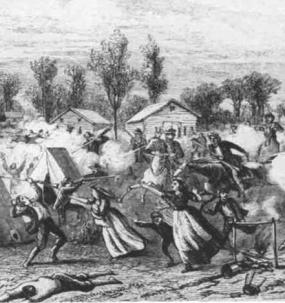 The hamlet had increased from its normal size, when hostilities broke out. Members en route to Far West had camped near Haun's Mill for a few days in their wagons and tents. As a result of miscommunication and feelings of powerlessness to resolve what local Missourians perceived as offensive Mormon military actions in the region, at 4:00 p.m., 30 October 1838, about two hundred-forty Livingston County regulators and other volunteers caught the settlement by surprise. Attackers approached from all sides but the creek on the south. Nathan Knight was on his way to a nearby lake to shoot ducks. Comstock's men shot at Knight, cutting the string of his powder horn. Knight, and others ran to the community's blacksmith shop as planned.
